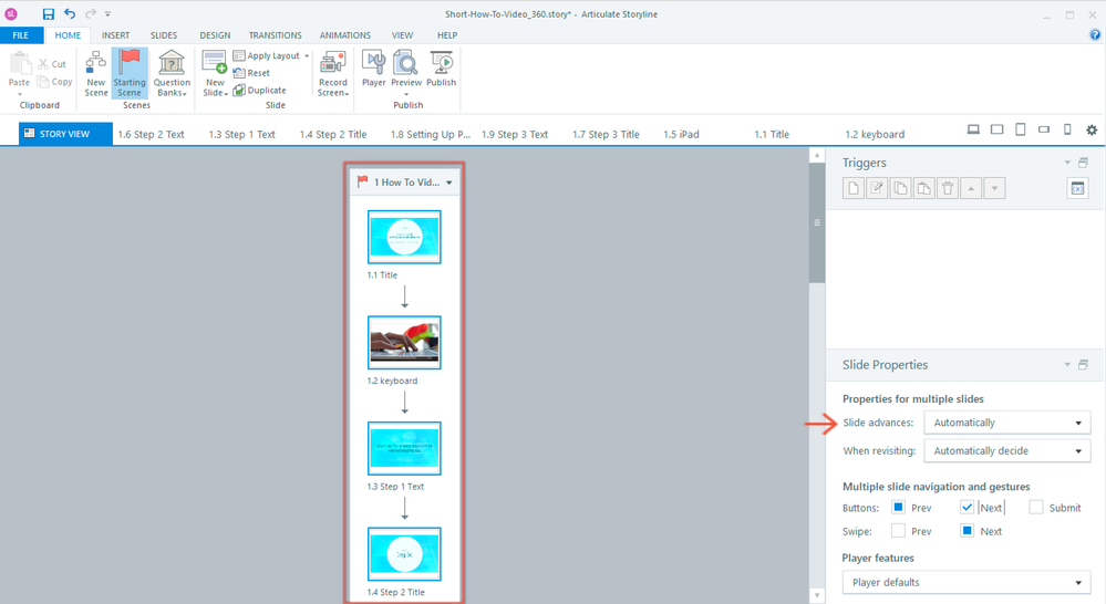 First, remove the next and previous buttons from all your slides by going into the Story View tab and selecting a slide. Then, hit Ctrl-A (or Command A on a Mac) to select all of your slides.