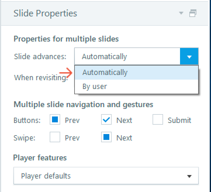 With all of your slides selected, you can adjust the slide properties all at once. For this project, I chose “Automatically” from the Slide Advances dropdown. Setting the slides to advance automatically dynamically creates slide triggers for each slide to jump to the next slide when the timeline ends.