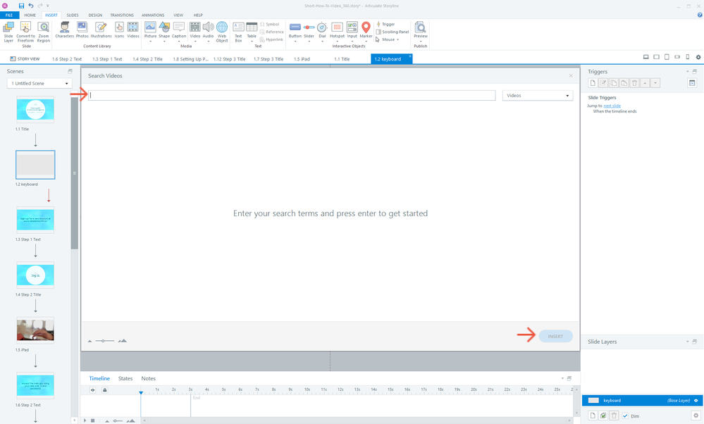 With the slide selected, click on the Insert tab in Storyline 360 and select Video from Content Library Grouping.
