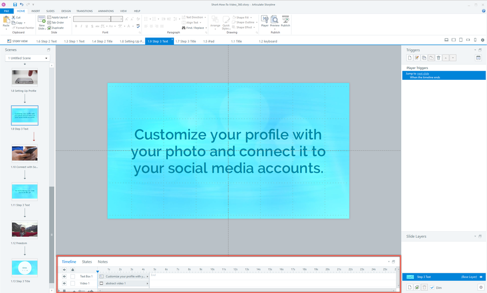 To keep viewers from having to click to advance, I decided to eliminate the previous and next buttons and use Storyline’s timeline trigger to advance the slides automatically. Here’s how: