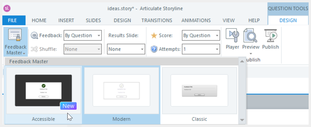 And if you already have a quiz in your project, it’s just as easy. To apply the accessible feedback master to your quiz slide(s) go to your Story or Slide View, hold down the Shift or Control key as you select the question slides you want to update. Then, go to the Question Tools—Design tab on the ribbon and use the Feedback Master drop-down arrow to select the accessible feedback master.