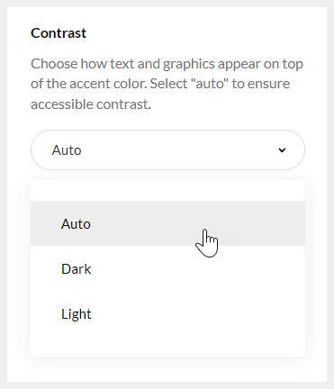 - Auto: Turns text and meaningful graphics to black or white automatically depending on your theme color to meet the minimum accessibility contrast requirements (4.5:1). We recommend using this option when possible to ensure everyone has a good experience with your course.