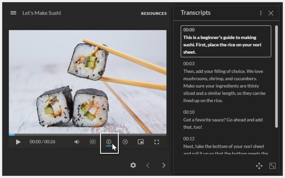 When learners take your course, they can view the video transcript by selecting the Transcripts button.