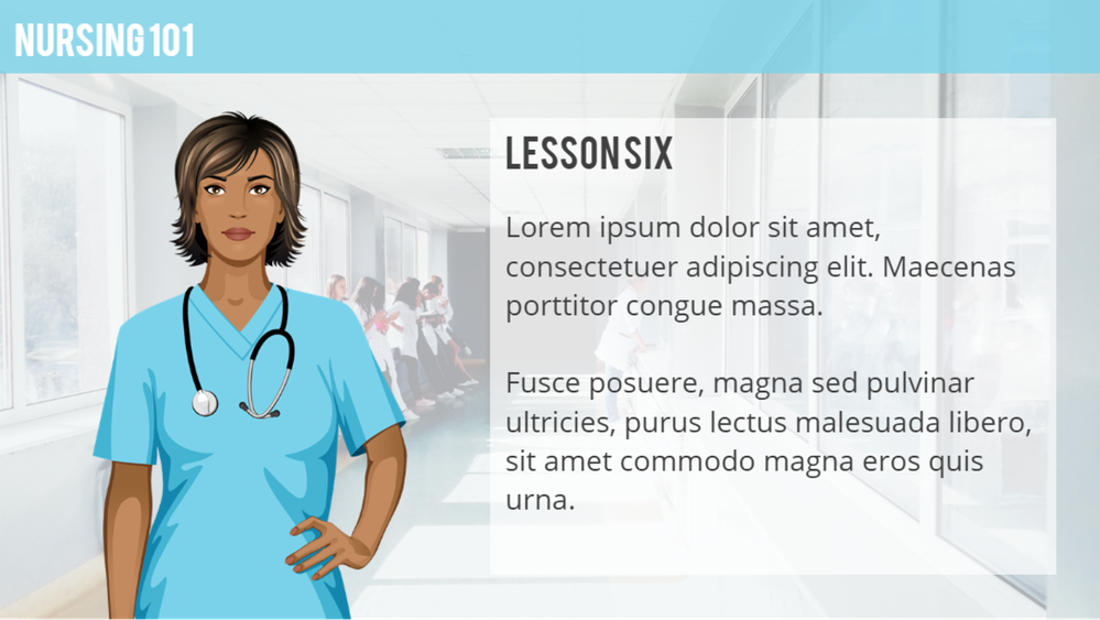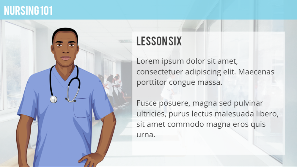 See how nice it looks when the nurse’s scrubs perfectly match the blue accent color of the course? Now let’s take a look at that same slide with another character.