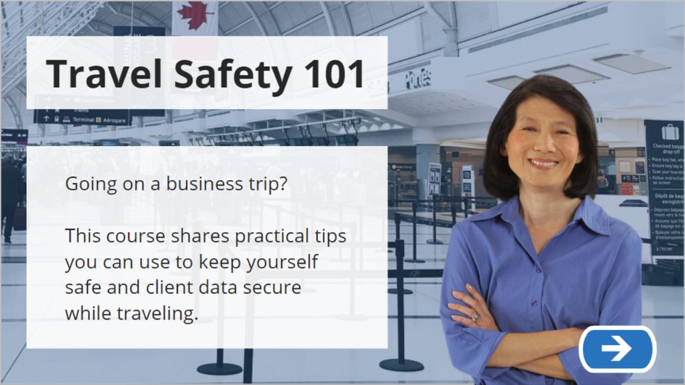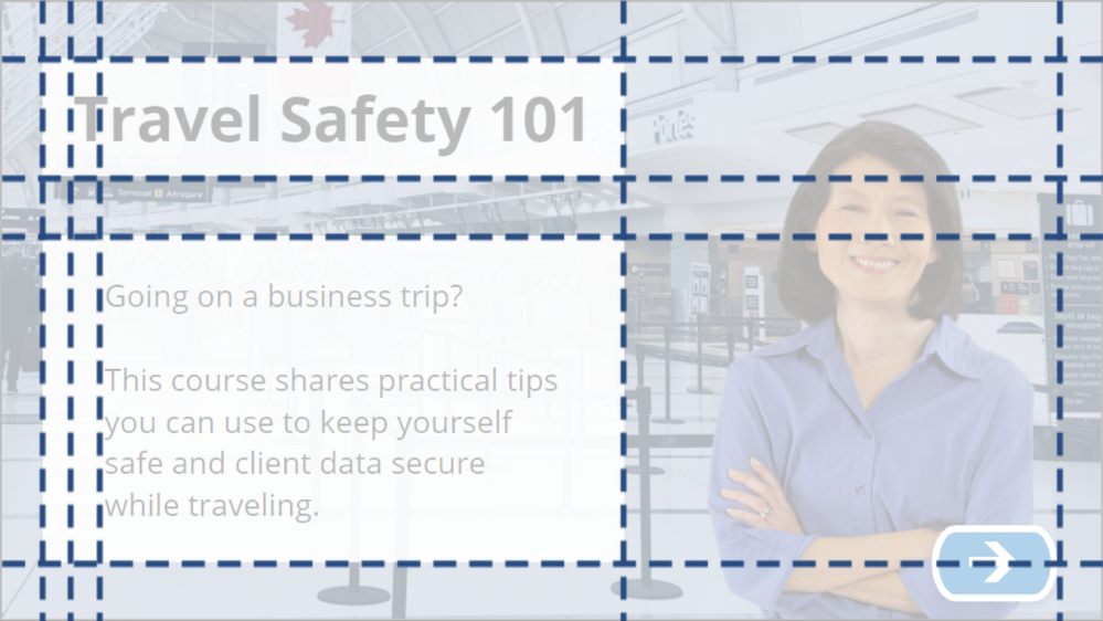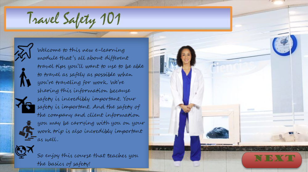- Get rid of off-topic imagery. The topic is travel safety, but the background is a hospital and the character is wearing scrubs. Replacing these images with travel-themed options will feel more on-topic. As well, let's assume the on-screen character is part of a course scenario. In that case, she makes sense to introduce here. But if she didn't actually play a part in the course, removing her completely might be the best option.