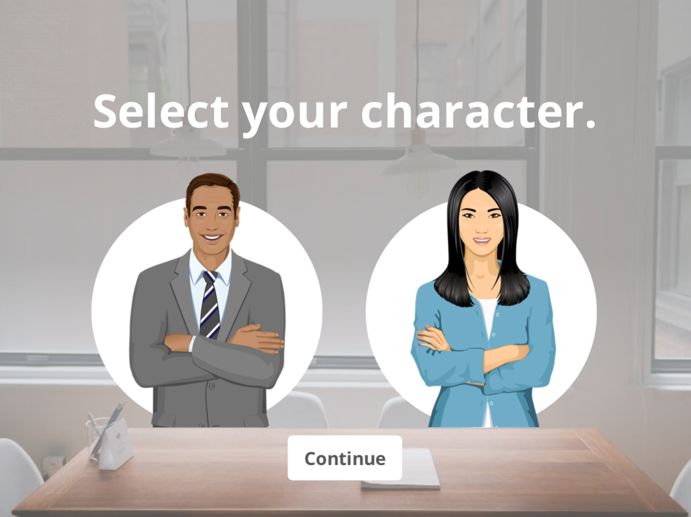 In this example, notice how you get to choose between a female or male character at the start of the scenario and then that character appears throughout the course.