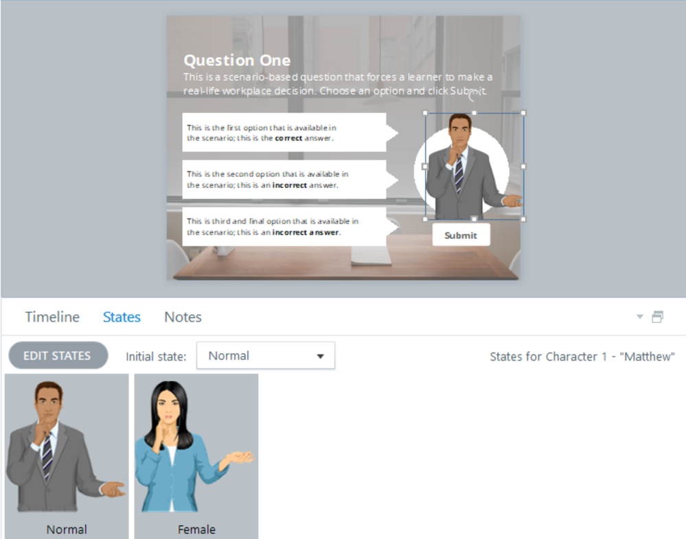 And there you have it—a quick and easy way to easily use a single variable, states, and triggers to control a learner’s avatar in a Storyline course.