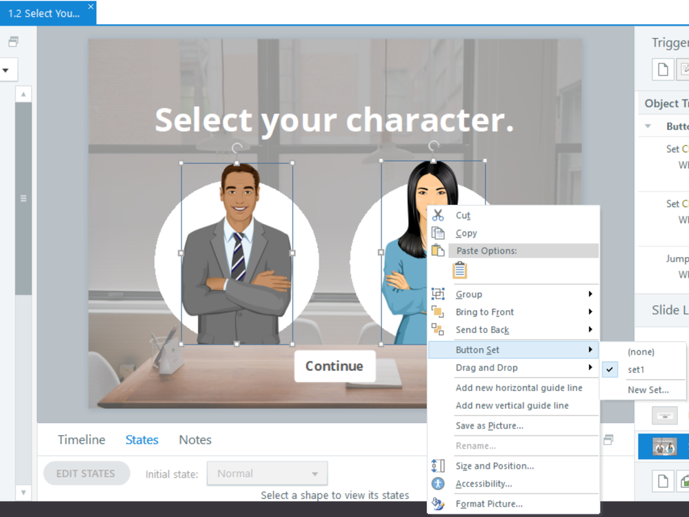 Next, back on the slide where learners choose their character, select both of your characters to create a button set.