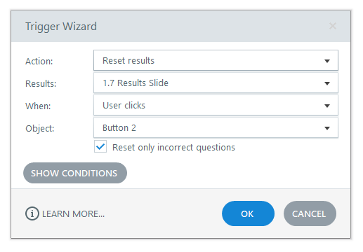 Your final step is going to be to pop into the Reset Results trigger that appears in the trigger panel to check off the “Reset only incorrect questions” option.