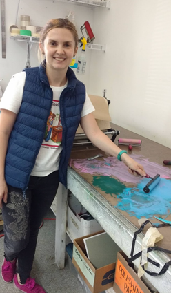 Ekaterina at Alberta Printmakers, Calgary, AB (2018). This photo illustrates her hands-on learning experience in her field of study.That creative foundation eventually led her to her current role as a Courseware Developer at CAE Inc., where she creates training for aviation professionals—primarily pilots—across both e-learning and instructor-led formats.