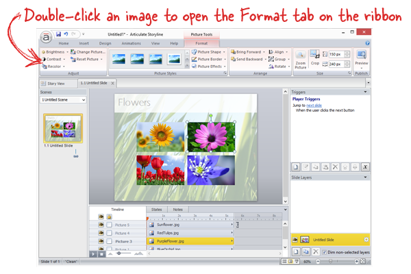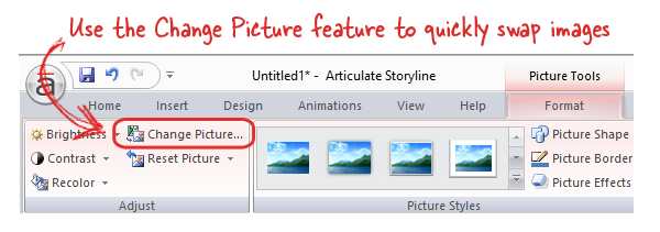 Besides these simple photo-editing options, Storyline also has 10+ pre-made picture styles so you can customize the look of your project with a single click. Simply choose one of the pre-made picture styles to add a border, turn your photo into an oval, or add an easy drop-shadow effect.