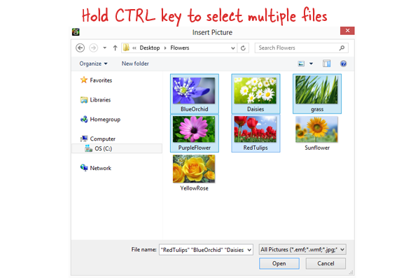 If you’ve ever worked in an image-intensive course, you know that inserting each image manually can be tedious and time-consuming. With Storyline, however, you can insert multiple image files at once by holding the CTRL key and selecting the images you’d like to add to your slide. Click Open and all of your selected images will be added to the slide.