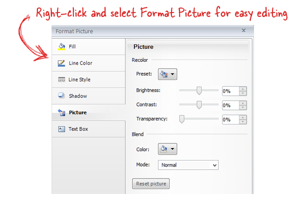 Storyline has tons of features for making simple edits to your photos and graphics. Some are available on the ribbon, but you can also right-click on an image and click Format Picture to open a Format Picture panel. You can adjust the contrast, change the brightness, lower the transparency, and more, right from the menu. You can also add a color filter, or turn your photo into a black and white image, to give the photo an artistic feel.