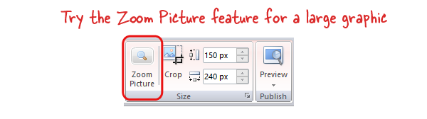 Do you want to show a large picture, but only have room for a thumbnail? Then consider using the Zoom Picture effect. Simply choose your image or graphic and click the Zoom Picture button on the Format tab on the ribbon. This will automatically add a little Zoom icon on the bottom right-hand corner of your image. When the user clicks the button, the full-size image will pop up on the slide. This is a great way to incorporate your full-size images without overtaking the whole slide.