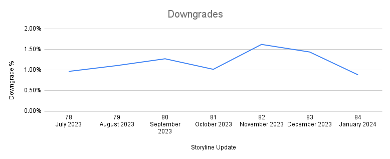 Line chart showing Storyline 360’s downgrade percentage for updates 78 through 84.