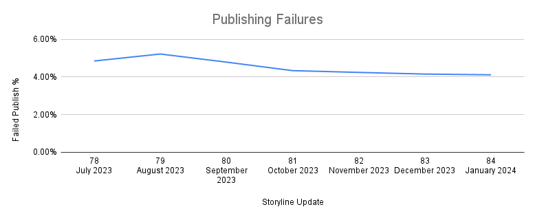 I shared this metric for the first time in my final monthly update last September. We initially saw that nearly 6% of publishing operations were failing. We reduced that number to 2% in June (not shown in the graph below), but it later climbed to about 5.5%. Since then, it’s settled just north of 4%. We recently updated how we track publishing failures to provide more insight and help reach our goal of less than 1%.