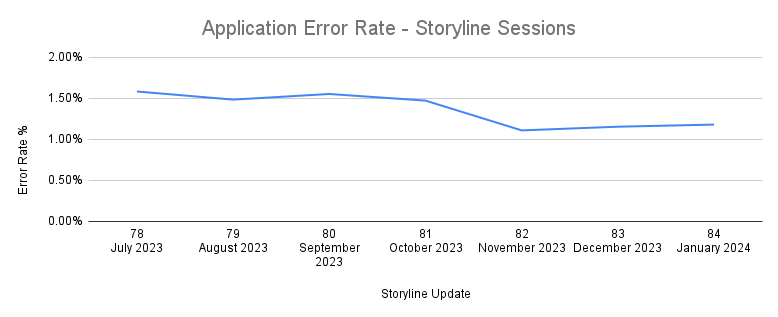 We track the percentage of Storyline 360 users who encounter one or more errors in each release. Back in September 2023, I reported that about 15% of Storyline 360 users had encountered an error when using Update 79. Unfortunately, that number ticked up to 20% as more users upgraded. Since then our efforts have this metric trending in the right direction, as the chart below shows.