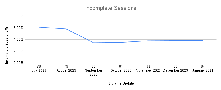 This metric tracks how often Storyline 360 quits unexpectedly due to an error. The last time I shared this metric, it hovered around 6%, but we suspected that Storyline 360 might sometimes fail to correctly record an event for the end of a session, creating false positives in the data that were inflating the number. In Update 80, we rolled out a change aimed at improving the accuracy of this data and found that closer to 4% of sessions experience this issue. Our goal is to drive this metric below 1%, because having Storyline quit unexpectedly is extremely frustrating for you and unacceptable for us.