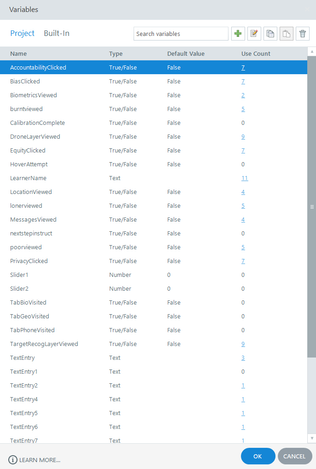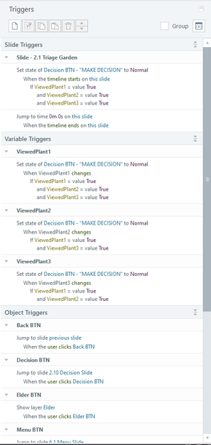 The course overall has a few hundred triggers (slide, object, and variable triggers) and somewhere around 40 variables (mostly T/F variables).