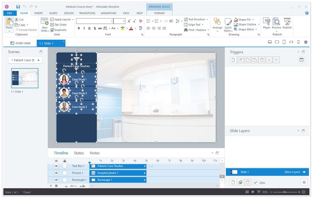 Let’s say I’m working on a medical course in Storyline 360. I’ve designed the beautiful slide you see below—it has a blue menu created using shapes, text, and images. I’ve also added a background image on the main part of the slide.