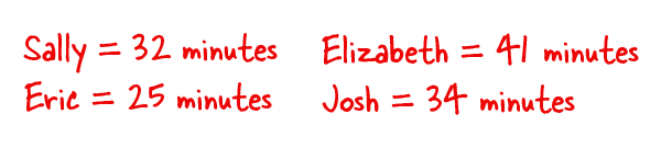 Calculating an average is very simple: add up all the duration times, then divide by the number of people that tested your course. For example, say you had four people test your course and they had the following durations:
