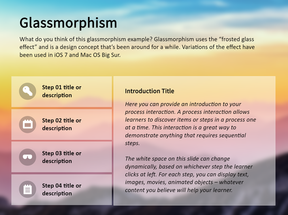 Illustrated backgrounds are another great option. They can help you set the stage and add some context to your course. Whether the background is to simply add visual interest or an integral part of your content, illustrations can be a good way to catch your learner’s attention and maintain their interest.