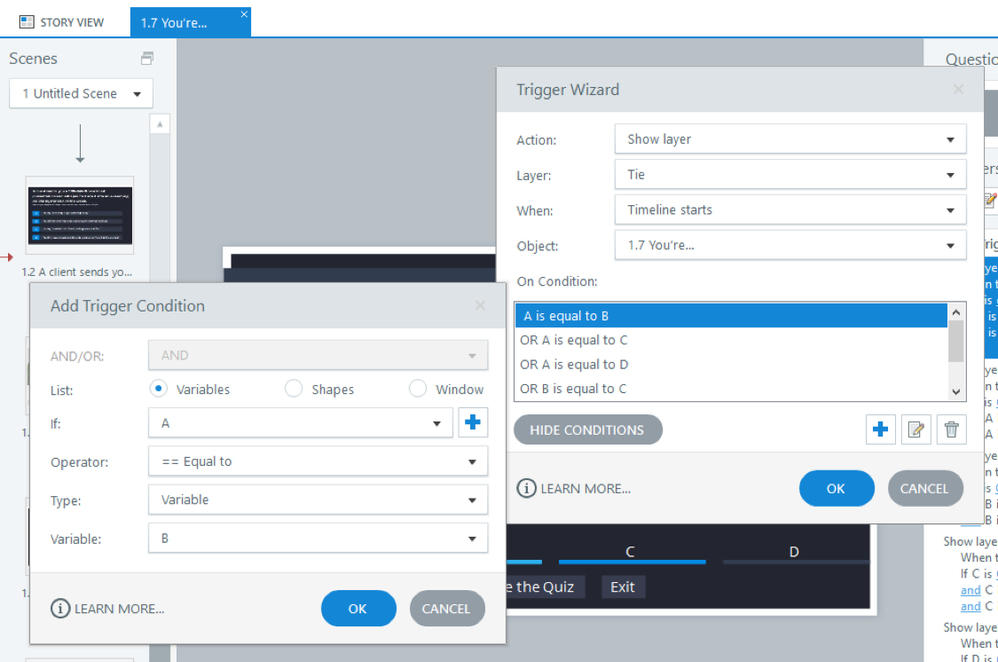 When the learner selects response A and clicks on “Submit,” variable A will be equal to 1 instead of 0. Copy and paste that trigger for each of your choices, making sure to swap out the variable and shape for each.
