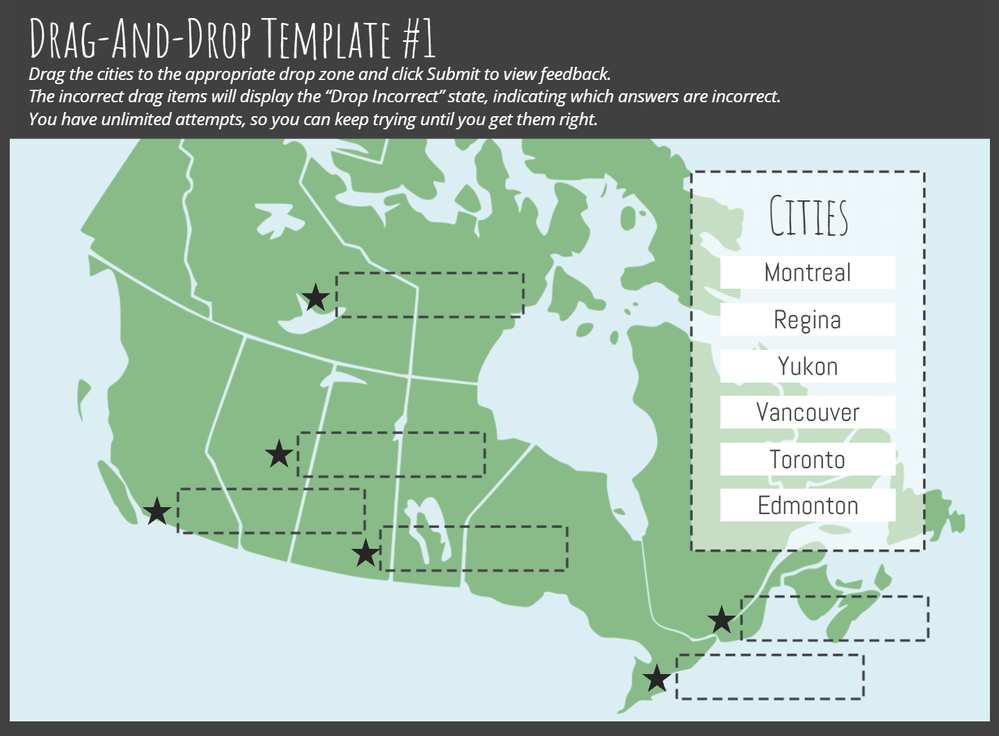 And in this course on Canadian geography, learners must drag the cities to the correct spots on the map:
