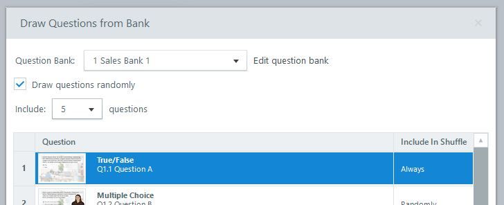 Here’s an example of how I can customize my question bank settings: I want to create a question bank that randomly draws five of the seven questions included in my bank, but I always want Question A to be included.