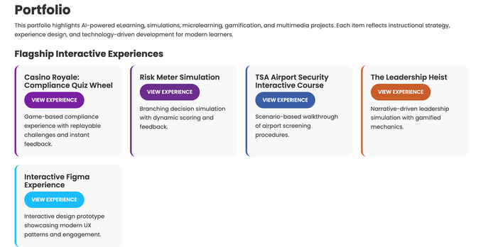 This month, we’re spotlighting the creative ways community members are designing, organizing, and evolving their e-learning portfolios. These examples highlight not just design work, but also strategy around how to present projects, frame your skills, and show the story behind your work.