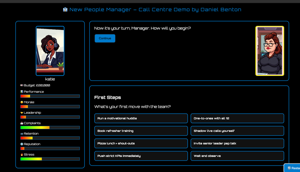 Daniel created a simulation where learners step into the role of a new call-centre manager, making choices that impact morale, performance, and stress. It features avatars, tooltips, and a narrative end summary, all co-coded through an iterative vibe-coding process.