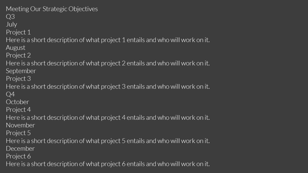 Would you feel comfortable presenting your learners with a slide like this? Probably not. When you don’t use text styles, that’s basically the experience you’re providing to your screen reader learners.