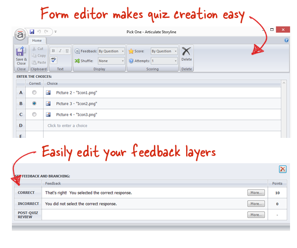 Everything you need to build your quiz slide is available in the freeform question form editor. While its appearance might change depending on the type of freeform question you use, the functionality is similar and simple for each one. Just choose the items for each column of the drop-down menu, and make the appropriate selections. The editor also has options where you can edit your correct and incorrect feedback layers.