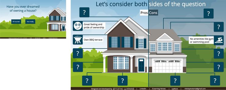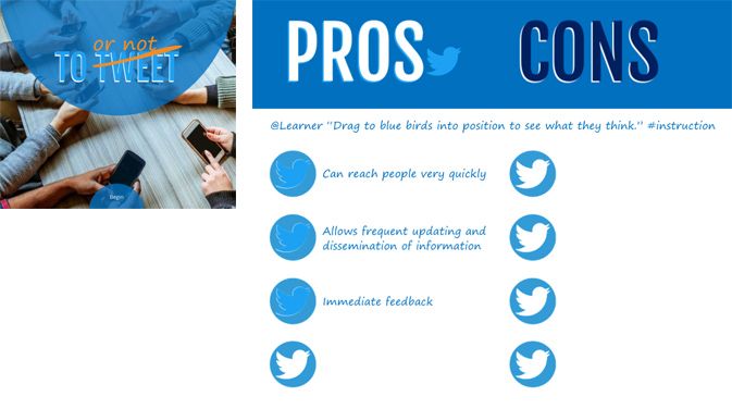 This week’s challenge asked course designers to share examples of “Pros and Cons” in e-learning. Examples include: checklists, interactive dials, sliders, sorting activities, and more!
