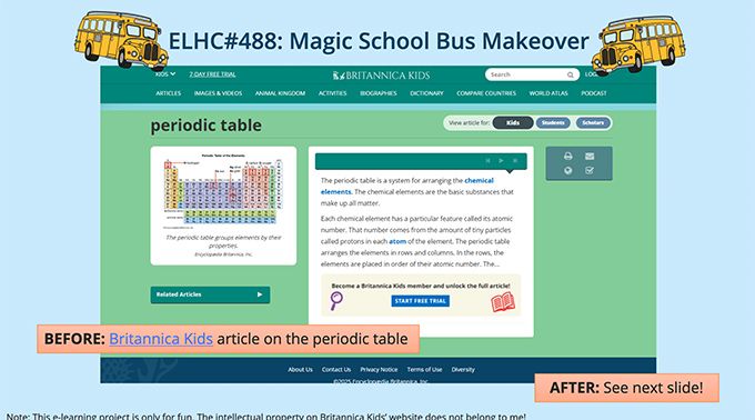 This week’s e-learning challenge invited course designers to create examples inspired by the Magic School Bus storybook series.