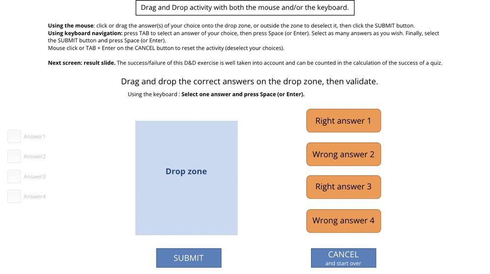 For a module that had to be accessible to learners with motor difficulties and, therefore, entirely usable with keyboard navigation, a client asked me to propose interactive activities (quizzes) that could be used with the mouse and keyboard so there would be no difference. So I worked on two drag-and-drop templates to show how it can be done, as they are a priori the most complicated activities to do without the mouse: a classic drag-and-drop and a reorganization activity (a little more complicated because there are several drop zones). The way I've found to do this is to use motion paths to "drag," and the "drag and drop" are hidden "True/False" and "Multiple Choice" activities.