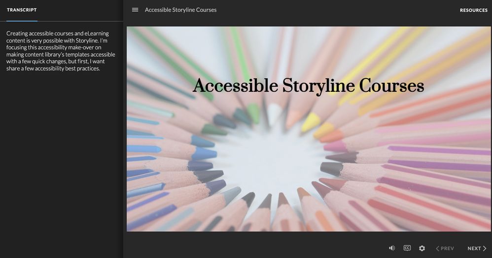 I got the idea from Jodi's entry in the last accessibility challenge to makeover a few slides from Content Library. I concentrated on alt text, color contrast, and focus order, but those scratch the surface of what accessible eLearning looks like. I also included a checklist of things to consider when designing accessible Storyline courses. Excuse the quality of the audio recordings on this; I put it together quickly.