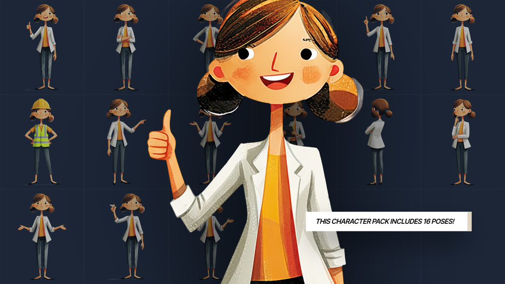 This illustrated character comes with 16 different poses. I upscaled the images and gave them transparent backgrounds. I create these while practicing AI prompting techniques. Feel free to use as you wish for personal or commercial projects.