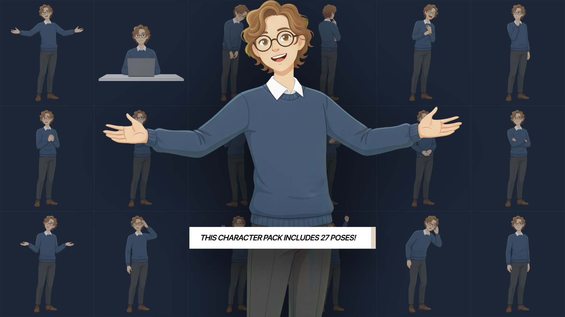 This illustrated character comes with 27 different poses. I upscaled the images and gave them transparent backgrounds. I create these while practicing AI prompting techniques. Feel free to use as you wish for personal or commercial projects.