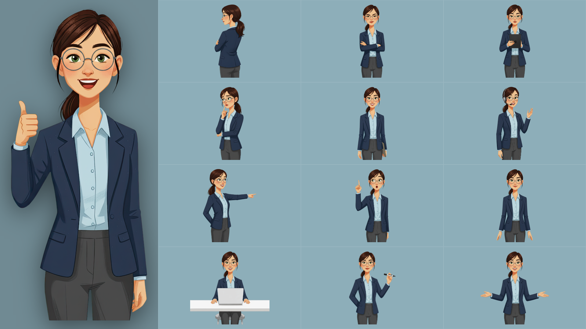 This illustrated character comes with 16 different poses. I upscaled the images and gave them transparent backgrounds. I create these while practicing AI prompting techniques. Feel free to use as you wish for personal or commercial projects.