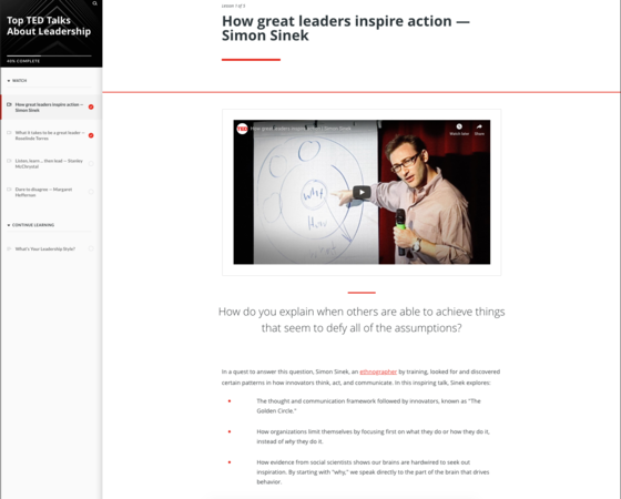 Creating a leadership training program? Check out this inspiring Rise 360 example I made using four hand-picked TED Talks on leadership. To reinforce the points made in each video, I paired the embe...