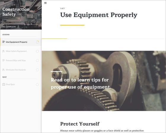 This construction safety demo showcases the beautiful, responsive lessons you can create with Rise. Check out the interactive labeled graphic, the quiz, and more.