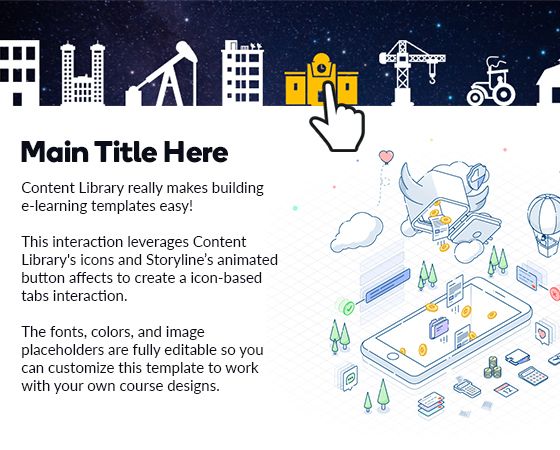 Storyline Templates 1 MIN READGraphic Design Tabs Interaction for Storyline 360MontseaSuper Hero7 years ago Show learners around with this fun tabs interaction based on a graphic design icons. See this project in action Updated 4 months agoVersion 2.0Design-Icon-Tabs.zip3.9 MB