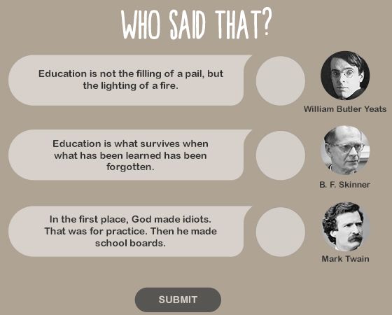 This one’s a fun little “Who Said That?” drag-and-drop matching interaction. You’ve got four famous literary authors on the left and four quotes on the right. The learner’s job is to match each author to the famous quote. Everything was created in Storyline so you can easily update the design using theme fonts and colors.