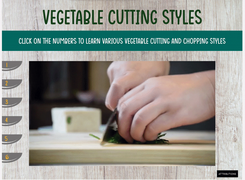 This virtual cooking class uses a series of videos and custom buttons to introduce different cutting and chopping styles.