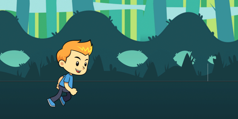 Here’s a good example (with source file!) for getting started with character animation. The walking cycle is short and simple and used primarily as an entrance animation effect. And because the animation isn’t looping, there aren’t as many details to worry about.