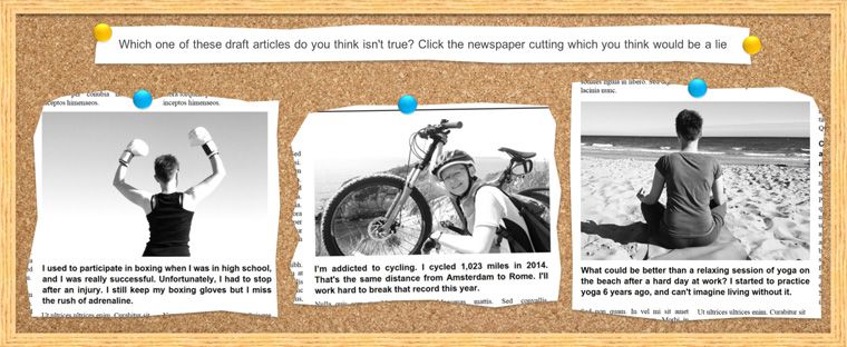 I like the newspaper design concept Joanna Kurpiewska used for her example. Using existing photos, Joanna created a bulletin board with three news articles. Check out her e-learning example to learn which two stories are true and which one’s a lie.