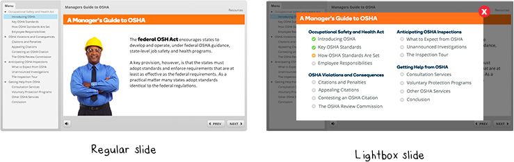 Lightbox slides give course designers an elegant solution for presenting learners with important resources without leaving the current slide. Some of the most common use cases for lightbox slides include: