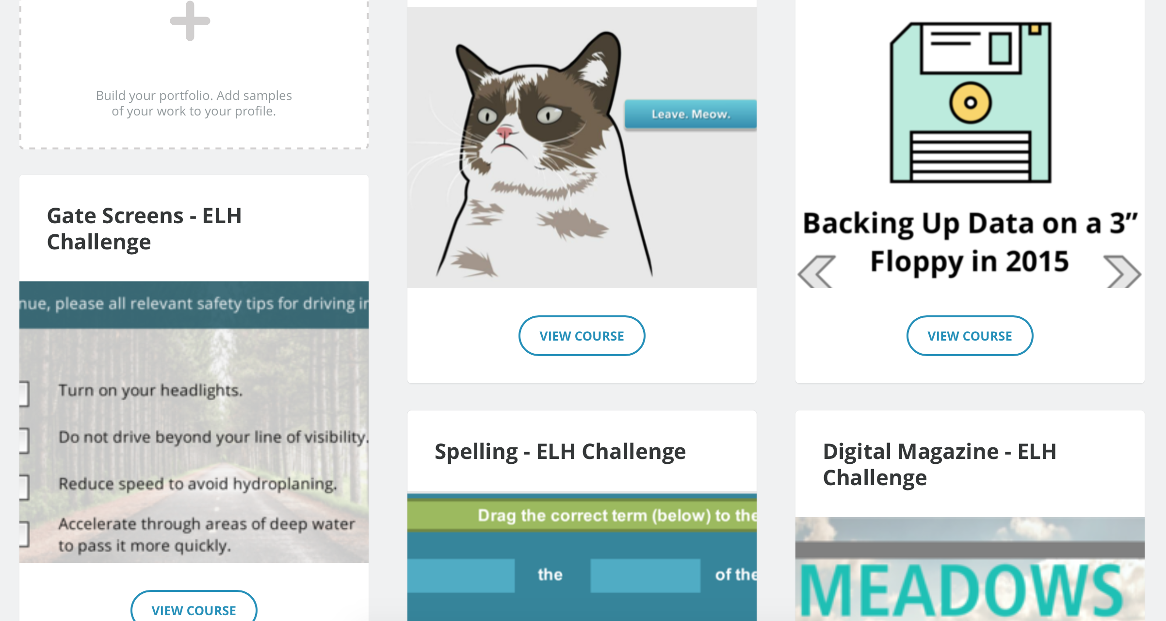 This week, your challenge is to build up your e-learning portfolio by adding your work (courses, examples, screencasts, and downloads) to your E-Learning Heroes profile page.