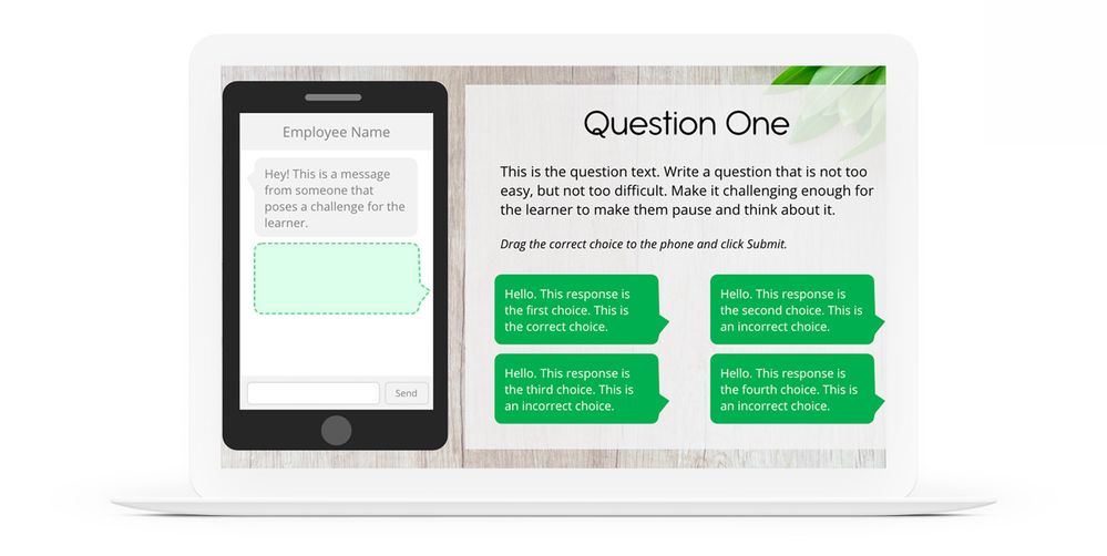 Here's a fun way to simulate a text conversation with drag-and-drop interactions. Simply drag the choice to the target area, click Submit, and view the feedback.
